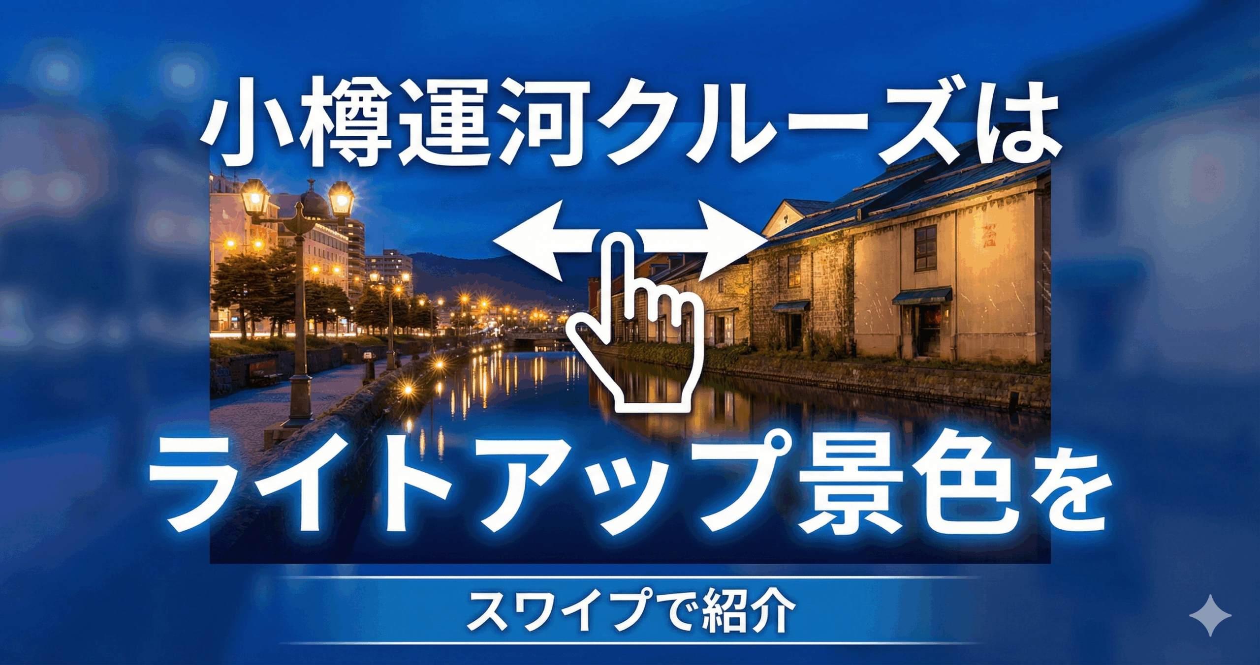 小樽運河クルーズのLPは、スワイプ操作を通じてユーザーに**夜景の「非日常的な体験」を追体験**させることを目指すべきです。LPのトップには**ライトアップの最高傑作**を配置し、スライド内で**昼間の景色との比較**を行うことで、特に夜のクルーズへの**予約意欲と価格への納得感**を高める戦略が有効です。