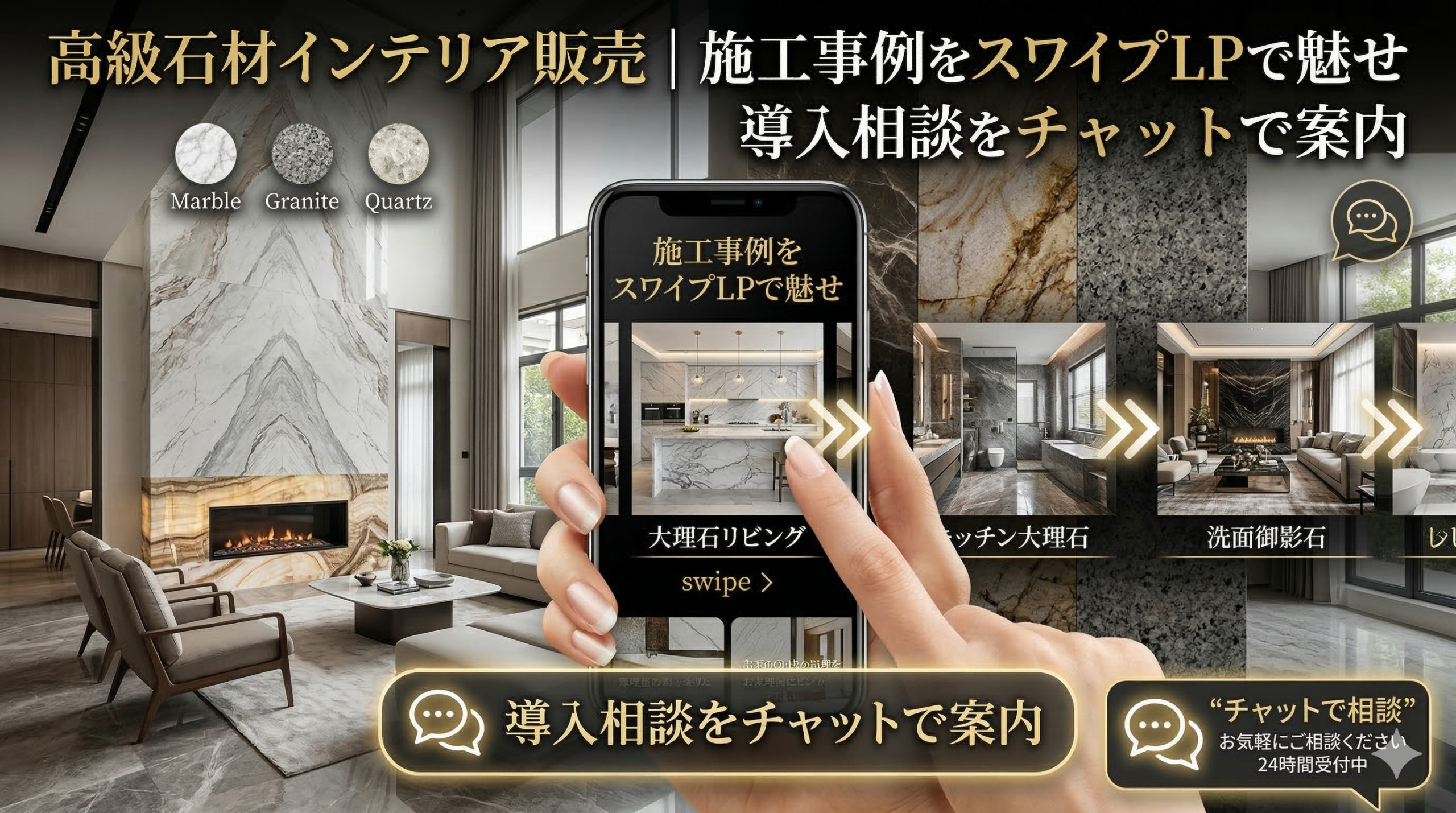 高級石材インテリアという分野は、「品質の高さ」が価格への納得感につながります。スワイプLPの写真の品質が、会社への信頼とサービスへの期待値を形成します。見た人が「この会社の仕事は本物だ」と感じられる写真を揃えることが、チャット相談への最後の一押しになります。石材の美しさを正直に、誠実に届けること——それが、高級石材インテリア販売会社の集客の本質です。