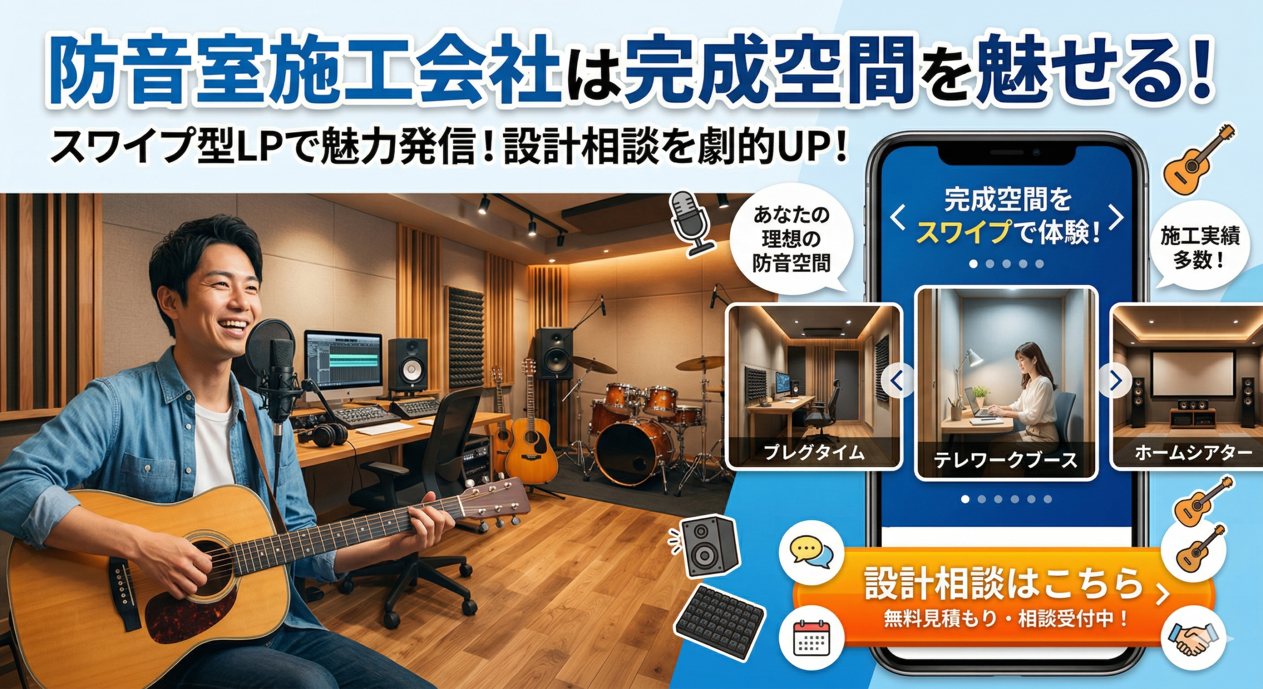 防音室施工会社は完成空間をスワイプLPで魅せ設計相談をチャットで案内