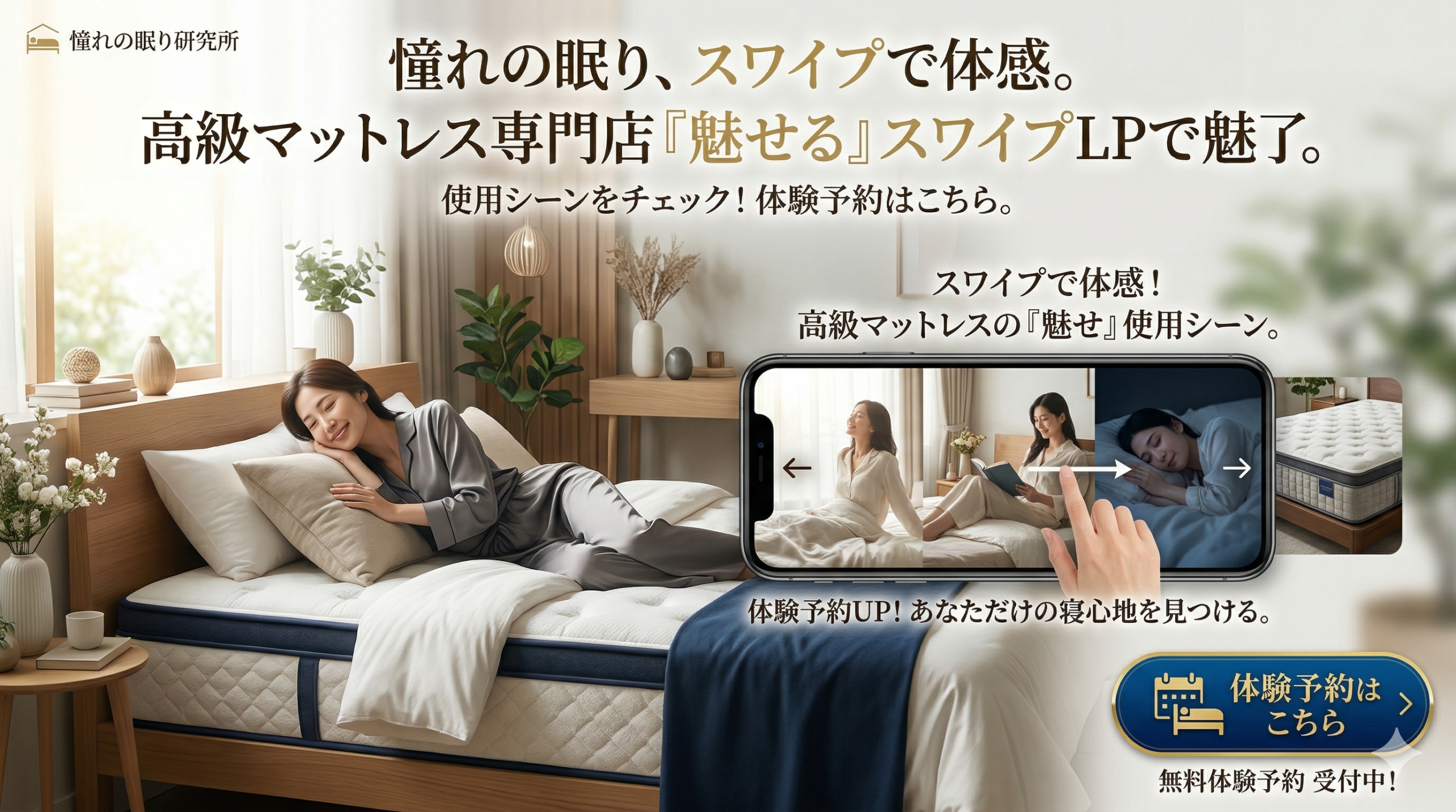 高級マットレスという「眠りの質を変える商品」の価値を、スワイプLPという体験の窓口を通じて正しく届けることが、今の時代の集客の本質です。「使用シーンで共感させ、チャットで一歩を下げ、体験で確信を持たせる」——この流れを整えることで、「いつか変えたい」という潜在顧客が「今試してみよう」という行動に変わります。今日から始める一歩が、来月の来店数に確実に反映されます。あなたのお店で眠りが変わる方を、一人でも多く増やしていきましょう。