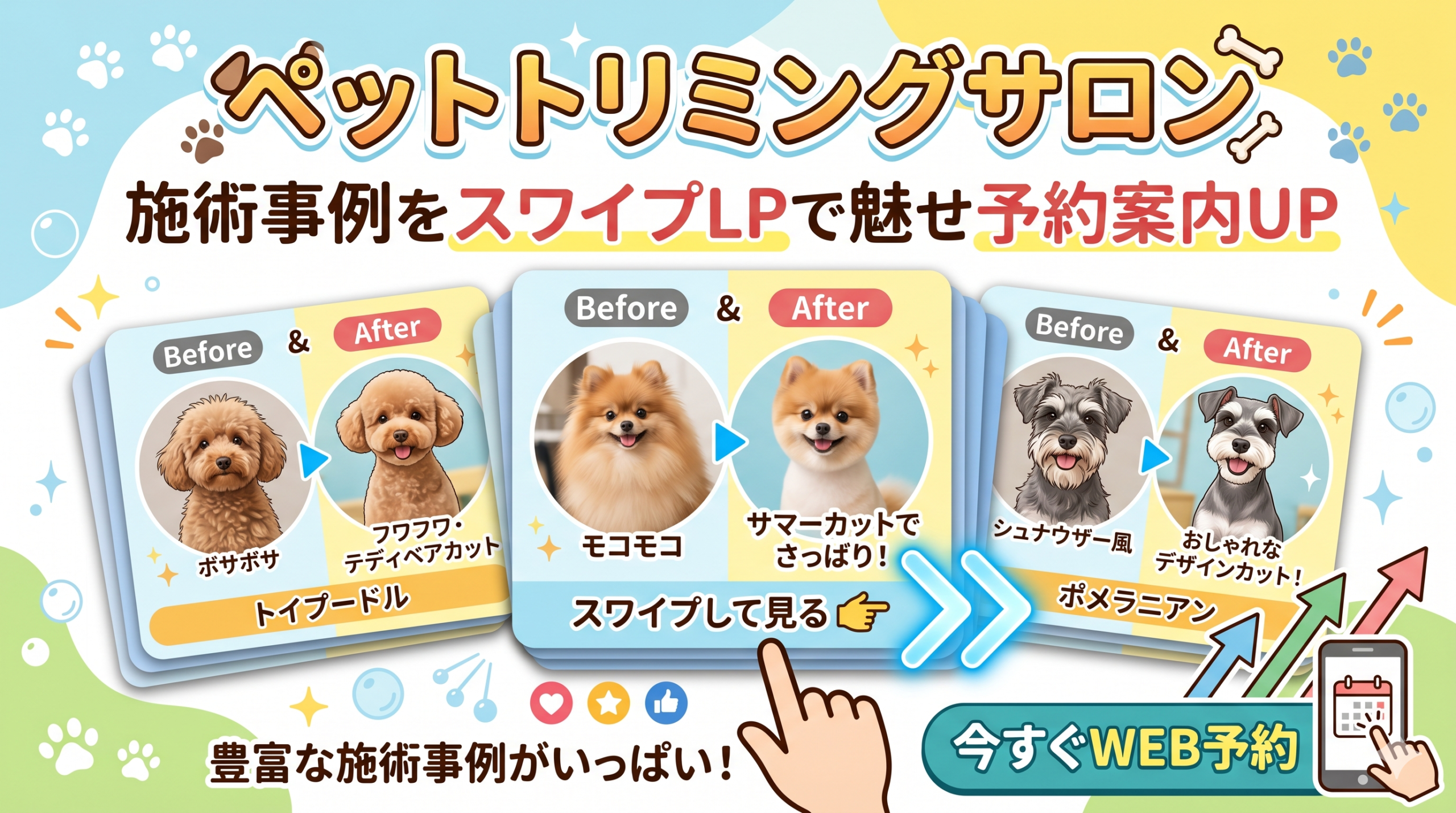 スワイプ型LPで「犬種別・カットスタイル別・施術前後の変化」を指で切り替えながら体験させることで、来訪者の「自分の愛犬もこんなふうにしてもらいたい」というイメージが育ちます。このイメージが「予約してみよう」という行動に変わります。