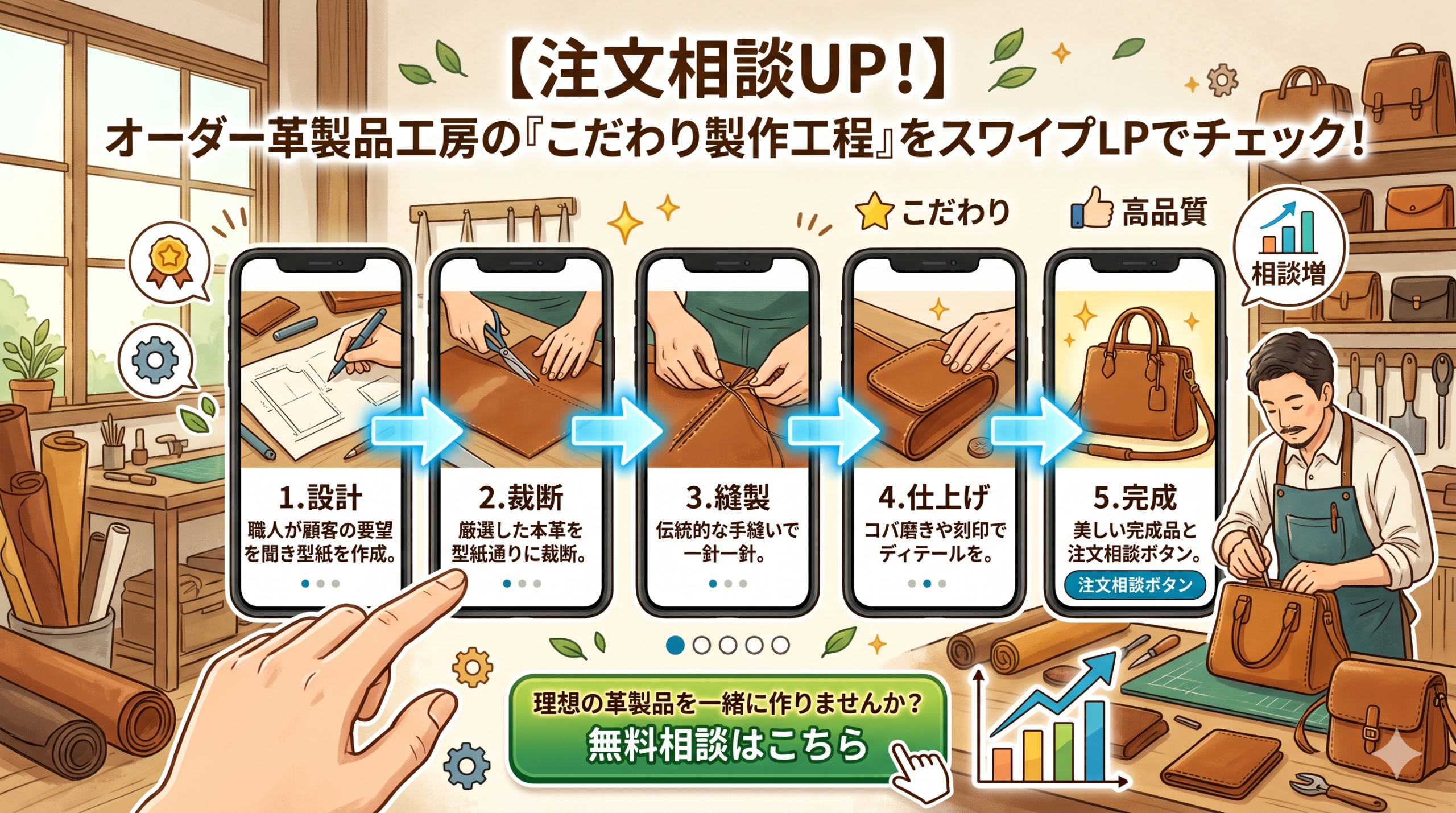 オーダー革製品は「作られる過程を見ることで価値が伝わる」商品です。革の裁断・縫製・仕上げという職人の手仕事を視覚的に体験させることで、「この工房に頼みたい」という気持ちが育ちます。スワイプ型LPで製作工程を魅せ、チャットで注文相談を案内する仕組みが、問い合わせ数と成約率を変えます。